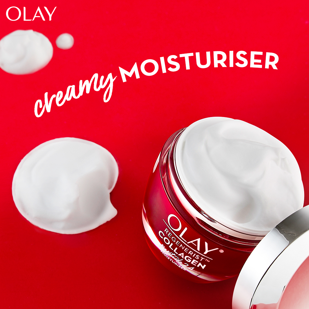 Plump & Bouncy Skin all day long. Olay’s Unique technology Collagen Peptide 24 penetrates^ better into the skin. Regular collagen have larger molecules that couldn’t penetrate into the skin. Olay’s Collagen Peptide is a smaller molecule, hence it penetrates^ better into the skin.